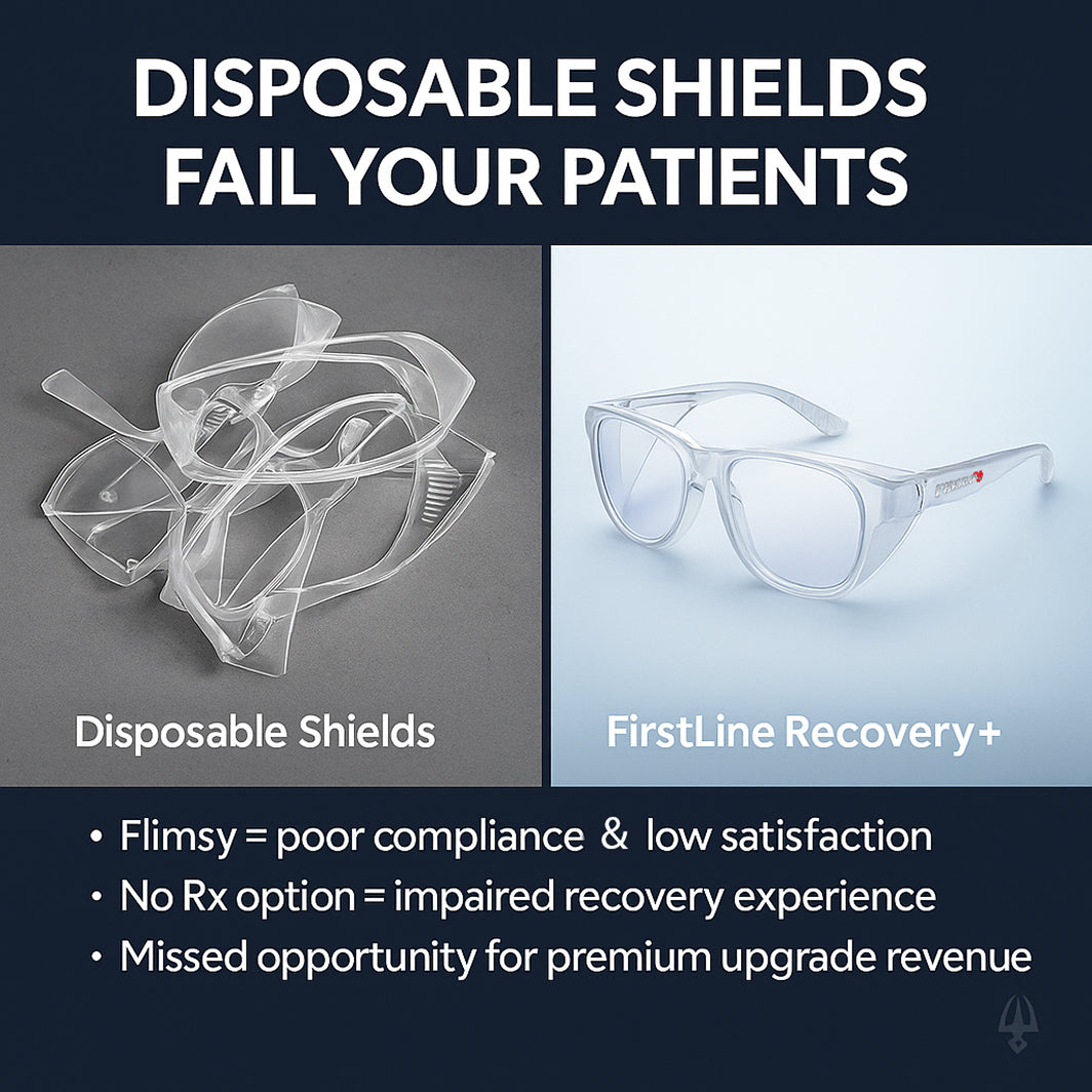 Clinical Fit | First-line discharge eyewear – ophthalmologists, ASCs, VA | Dual-purpose recommendation: discharge + workforce safety + lifestyle |
