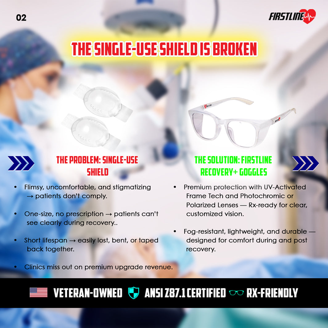 Integrates seamlessly into surgical recovery protocols globally; partners your clinic with a US Navy Trident Nuclear Submarine Force Service-Disabled Veteran-Owned, mission-driven vision health tech company.5-In-One Versatility – One goggle covers indoor, outdoor, glare, post-surgical, and workforce protection